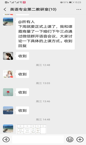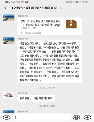 面对部分同学们对于新学期产生迷茫。英语专业教研室主任及时下达学校关于延期开学期间各项工作安排,让同学们做到心中有数,提前收心,做好线上学习准备。对于2016级毕业班的同学,要求同学们根据个人情况做好相关工作:论文写作、英语专业八级备考、研究生复试、求职等,规划好自己的未来,只争朝夕,不负韶华。
