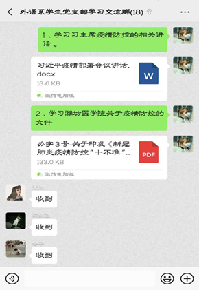 外语系学生党支部积极利用支部微信群、微信公众号等开展疫情防控宣传教育,集体学习“学习强国”习近平总书记在统筹推进新冠肺炎疫情防控会议上讲话和学校印发的《新冠肺炎疫情防控“十不准”》文件。及时转发上级各部门的文件和相关精神。同时告诫全体党员不信谣、不传谣、不恐慌,在疫情防控阻击战和教育教学工作中充分发挥党员模范带头作用。
