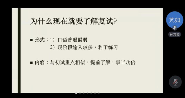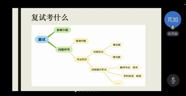 孙芃茹从面试流程和复试准备两个方面进行分享,她详细地向学弟学妹们介绍面试时应当注意的问题,及出现差错时应当如何应对,并提醒复试时注意“口语”,现阶段应当多输出、多练习,提前了解才能事半功倍。同时要注意口语材料的输出,并举了几个有趣的案例让大家加深印象。她从总结法和解释法两个方面总结了口语练习的好方法。
