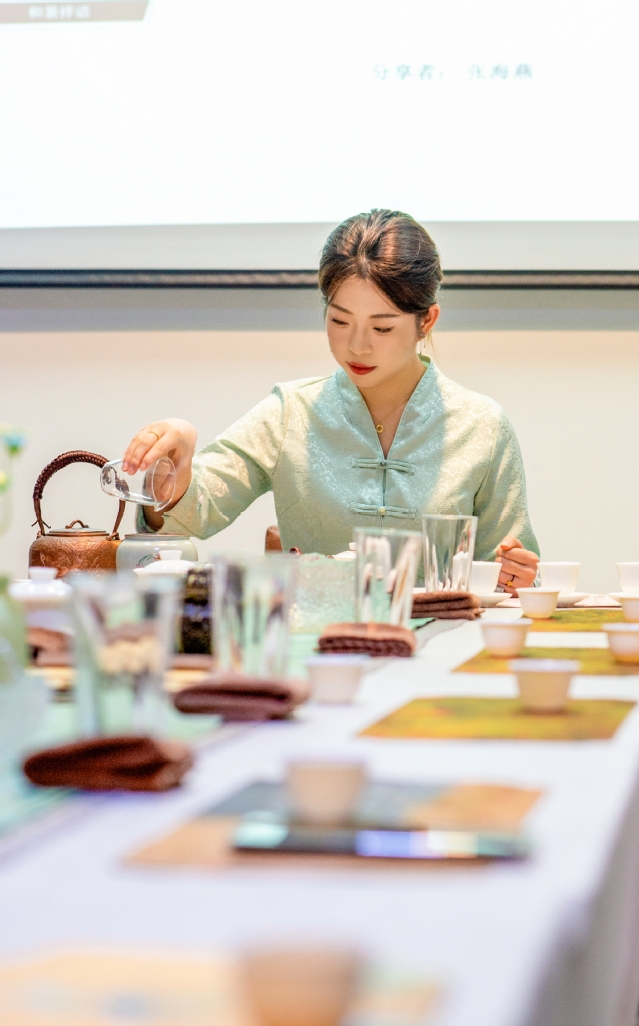 随后,茶艺表演为大家带来了一场视觉与味觉的盛宴,呈现了艺术与生活的交融。茶艺表演者配合张海燕的讲解,优雅地展示着泡茶的每一个步骤,温杯、投茶、注水、出汤,动作如行云流水,一气呵成。在茶艺师的指导下,在场老师和同学们纷纷亲自尝试《和荼九式》泡茶法,感受茶叶在水中舒展的美妙,品味茶香在唇齿间萦绕的韵味。大家在泡茶、品茶的过程中,不仅学到了冲泡技巧,更深刻体会到了茶韵之美。