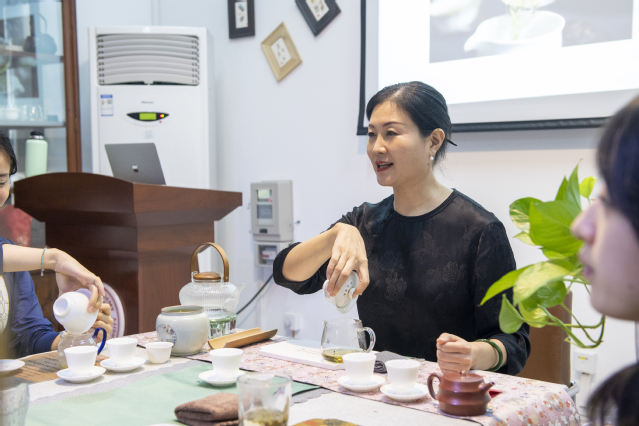 张海燕引导大家领略茶文化的魅力。她详细讲述了中国传统文化中茶的药用价值,让大家对茶的功效有了更深刻的认识。同时,她从茶的历史渊源、种类、制作工艺到品茶礼仪等方面进行了全面的介绍,在场师生一点点沉浸在茶文化的博大精深之中。