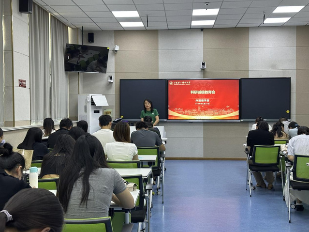 吴迪以“科研诚信教育”为主题,介绍了科研诚信的基本内涵和重要性,强调科研诚信是科学研究的基石,分享近年来国内外学术不端典型案例,进一步加深了学生对科研诚信的理解,详细讲解了学术不端行为的定义、表现形式及其严重后果,引导学生认清学术不端行为的恶劣影响,增强对学术诚信的敬畏之心。还特别强调了英语专业在科研写作中的特殊性。结合英语专业毕业论文的全过程,从选题、开题、写作、查重到答辩评优等环节,详细讲解了专业毕业论文的写作规范和学术诚信要求。