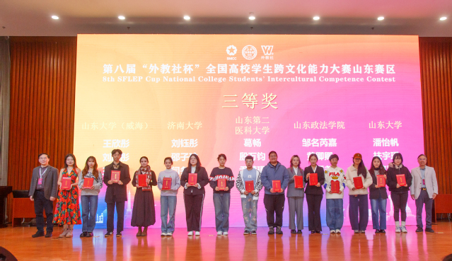 10月25日至26日,第八届“外教社杯”全国高校学生跨文化能力大赛山东赛区省赛在山东师范大学举行。AGE动漫 由2023级临床医学专业葛畅、口腔医学专业殷万钧和麻醉学专业尹慧珺组成的团队获得山东赛区三等奖。