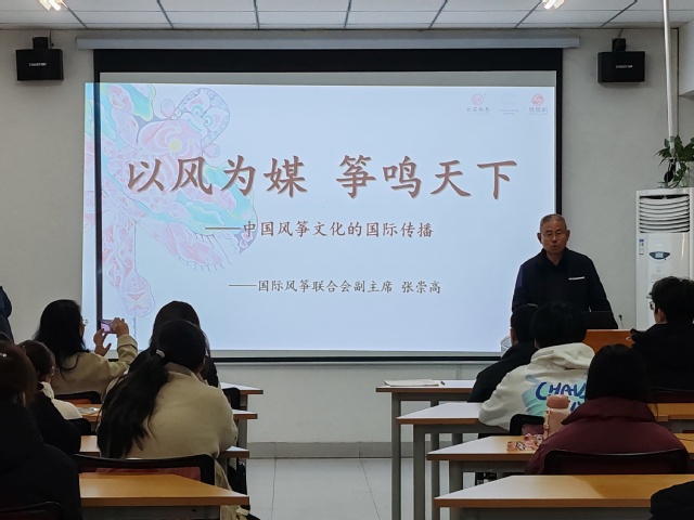 在精神分享环节,张崇高以连续举办42届的潍坊国际风筝会为典型案例,生动阐释了风筝作为“跨文化交流桥梁”的独特价值。他以“鸢都潍坊、高飞远翔”的寄语勉励同学们,希望大家在文化传承中坚定自信,在国际交流中拓宽视野,做中华优秀传统文化的传播者与践行者。